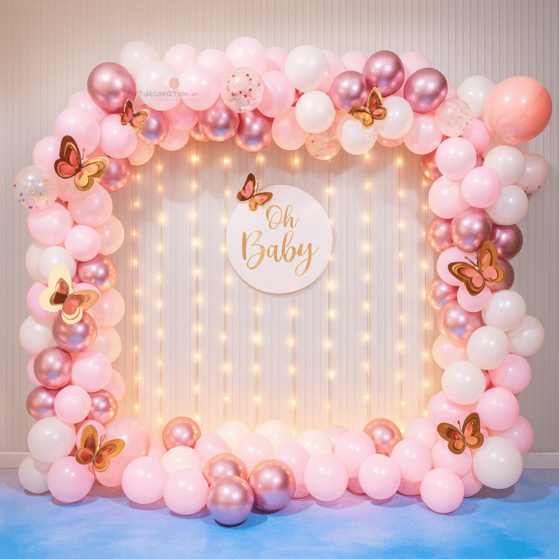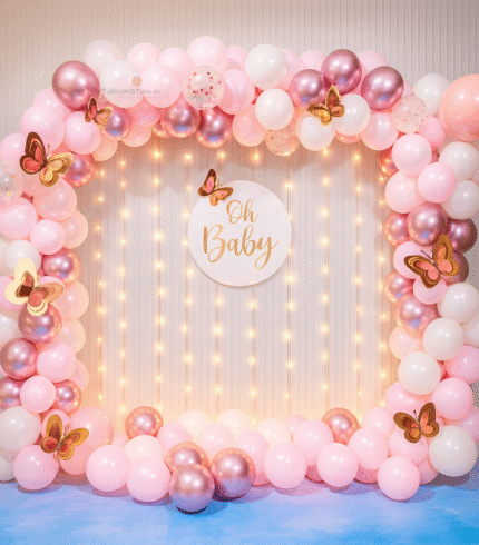 - Arch of 180 balloons of color: Pink, White, light Pink, and Rose Gold, Confetti balloons decorated with 7 Rose Gold butterflies